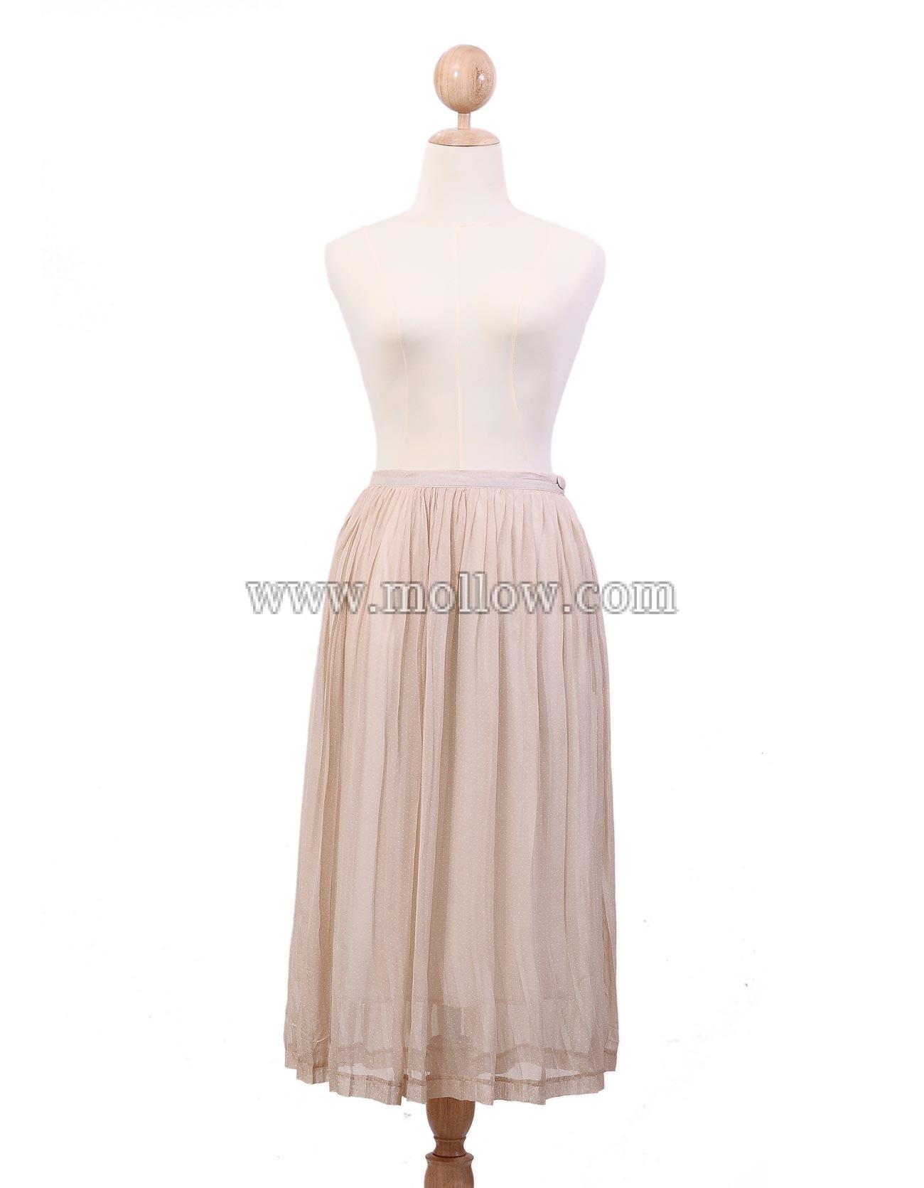 - ผ้าชีฟอง ลายจุดเล็ก ๆ จับพลีตเล็กน้อย ขอบเอวด้านหลังมียางยืด มีกระดุมและซิปด้านข้าง มีซับใน