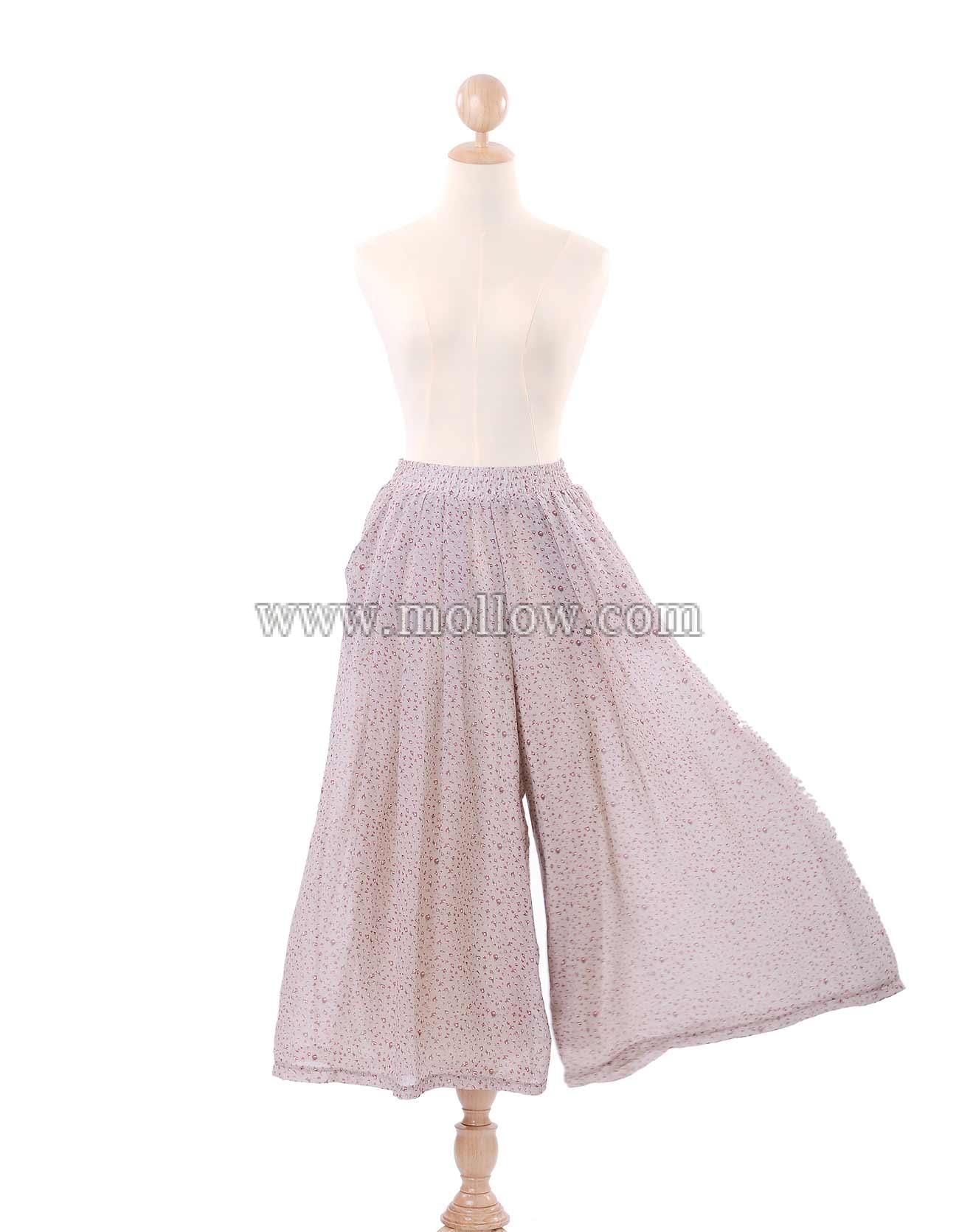 - ผ้าชีฟอง ลายดอกไม้เป็นกางเกงกระโปรง มีซับใน ขอบเอวเป็นยางยืด