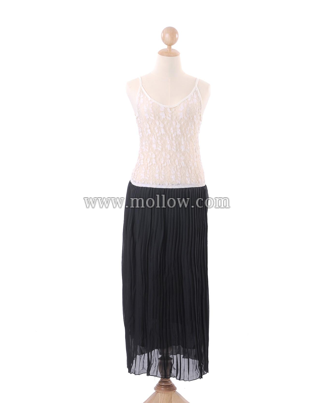 - ตัวเสื้อเป็นผ้าลูกไม้สายสปาเก็ตตี้ กระโปรงผ้าชีฟอง จับพลีตรอบตัว ขอบเอวยางยืด