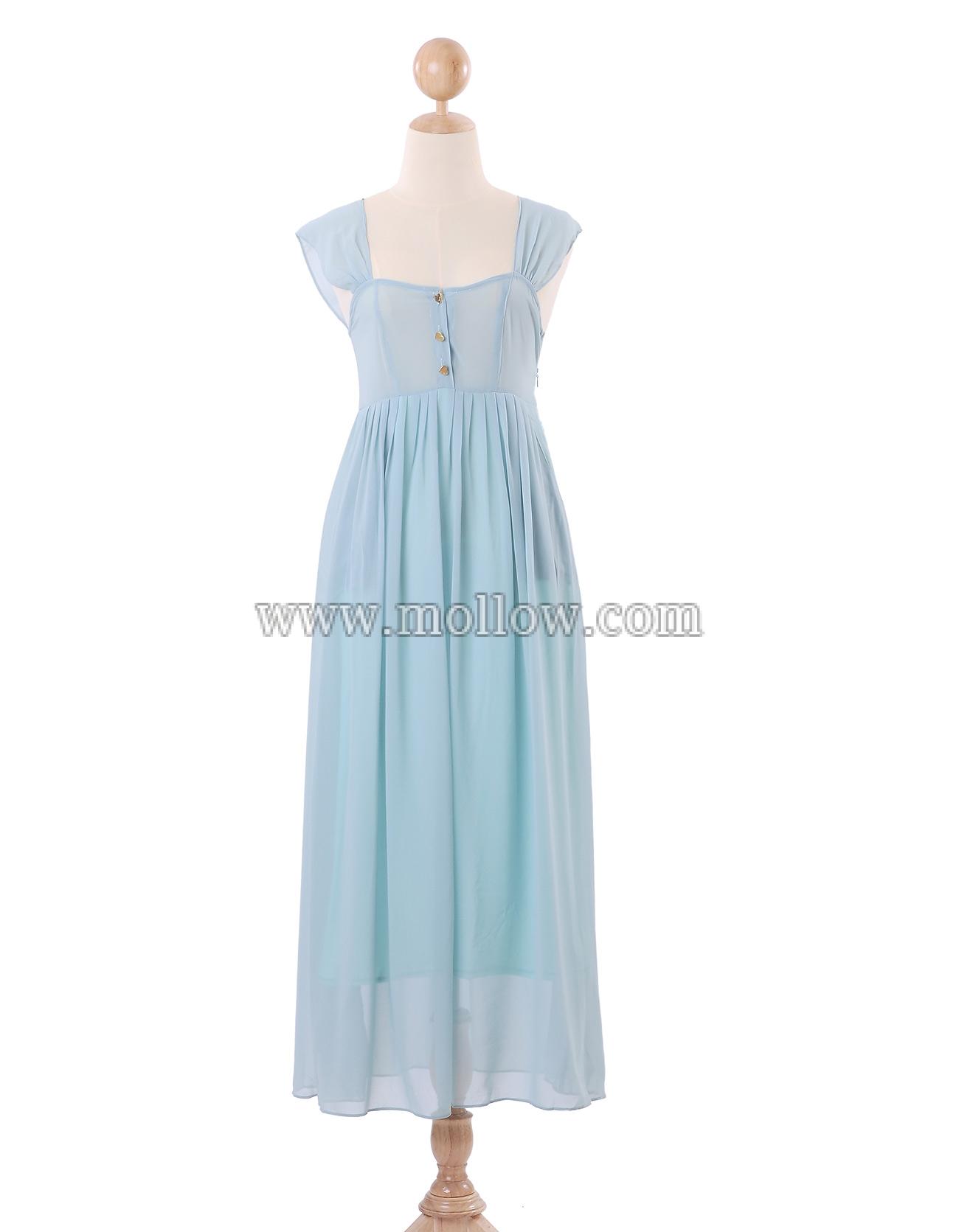 - ผ้าชีฟอง ทรงคอสี่เหลี่ยมมีกระดุมทองรูปหัวใจด้านหน้า มีซิปด้านข้าง มีกระโปรงซับในมีกระเป๋า 2 ข้าง ผ่าหลังรูปตัววี