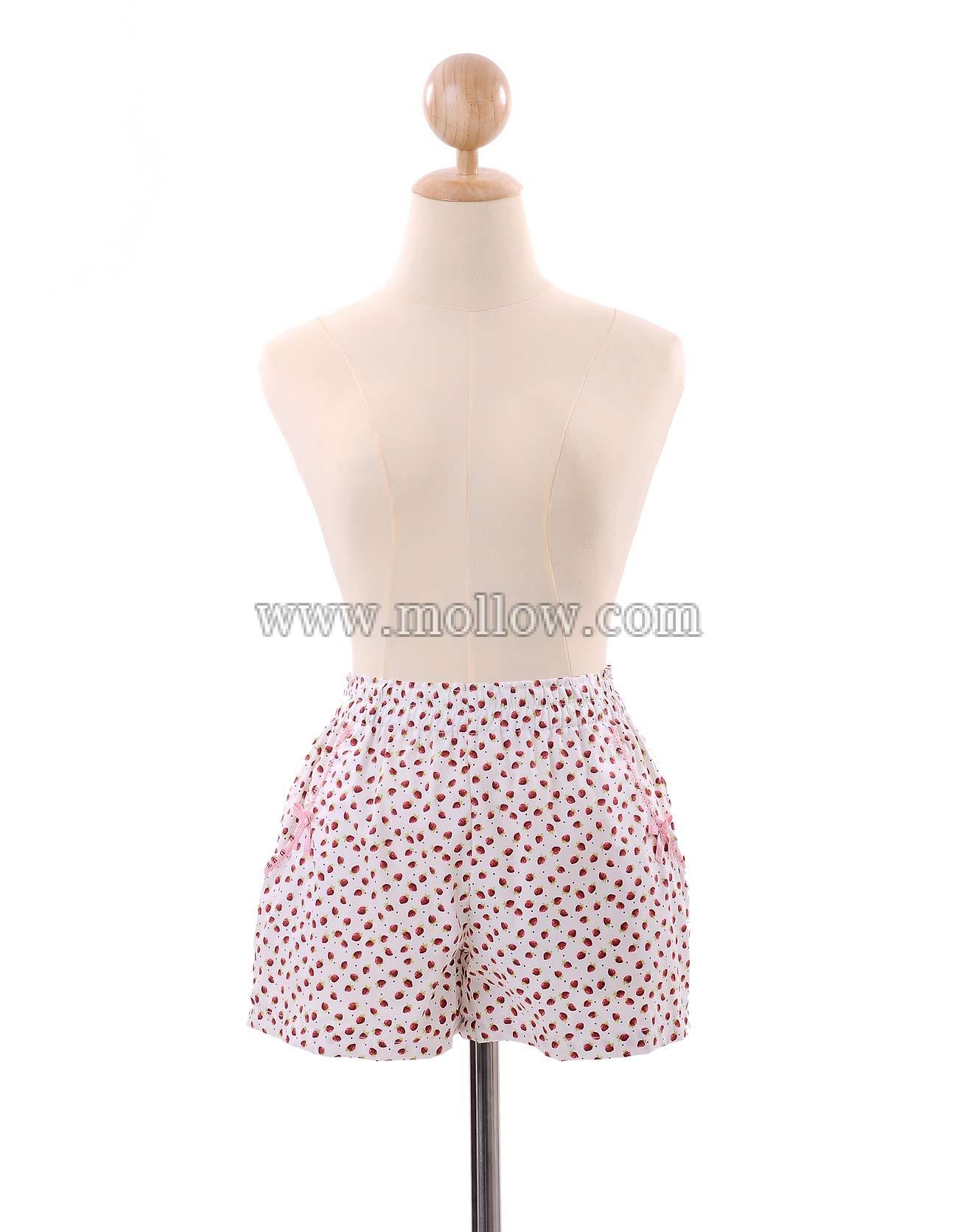 - ลายสตอเบอรี่ ยางยืดรอบเอวมีกุ๊นตรงกระเป๋าติดโบว์สีชมพู